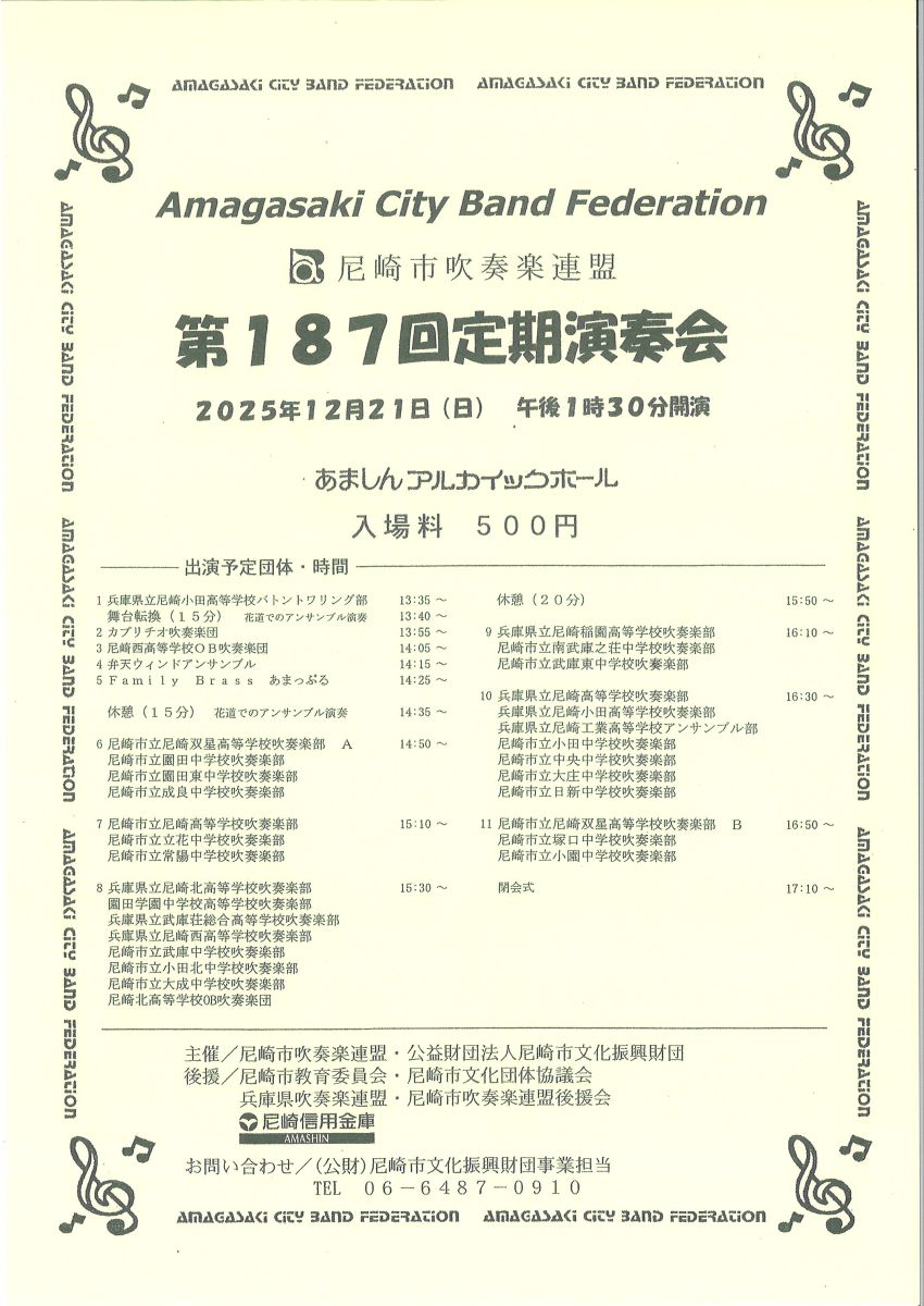 | 後 援 | 尼崎市教育委員会 / 尼崎市文化団体協議会 / 兵庫県吹奏楽連盟 / 尼崎市吹奏楽連盟後援会 / 尼崎信用金庫 |