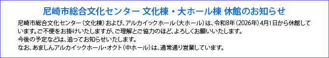 【重要】尼崎市総合文化センター 文化棟・大ホール棟(アルカイックホール)の休館について