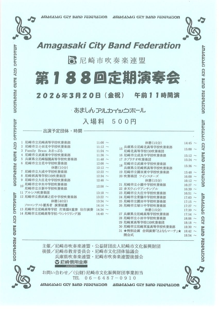 | 後 援 | 尼崎市教育委員会 / 尼崎市文化団体協議会 / 兵庫県吹奏楽連盟 / 尼崎市吹奏楽連盟後援会 / 尼崎信用金庫 |