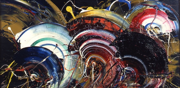 キャンバスに置いた油絵具の上をロープにつかまりながら素足で描くという、白髪独自のスタイルで描かれた代表的な作品です。 幼少期から愛読していた中国の物語『水滸伝』の登場人物の名をタイトルに付けた《水滸伝シリーズ》や、厳しい修行を行って僧侶になるほど傾倒した天台密教を主題とした《密教シリーズ》など、シリーズや制作年代により、多様な表現があります。